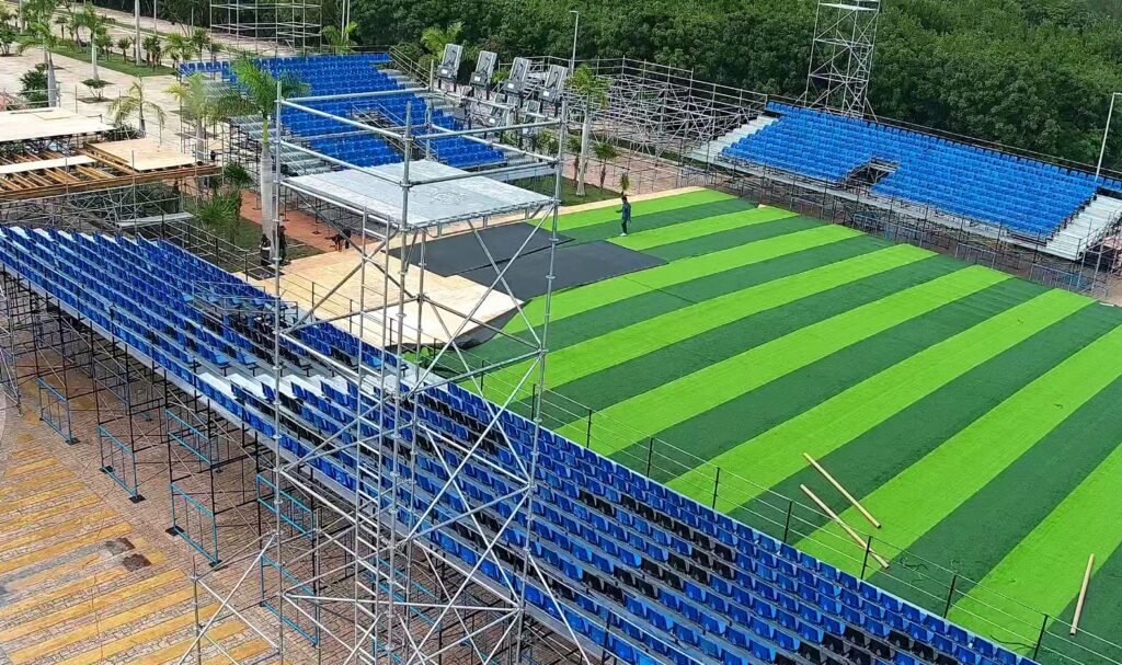 Las gradas de primer nivel se levantan con claridad, mientras que las plataformas y soportes del segundo piso y zonas VIP ya delinean la silueta final del estadio. En paralelo, comienzan a tomar forma las torres de alumbrado, esenciales para los partidos nocturnos y para el ambiente espectacular que caracterizará al Mundial Socca.