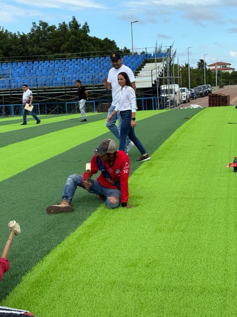 ANA PATY PERALTA SUPERVISA LA COLOCACIÓN DEL CÉSPED DEL ESTADIO PARA LA COPA MUNDIAL SOCCA