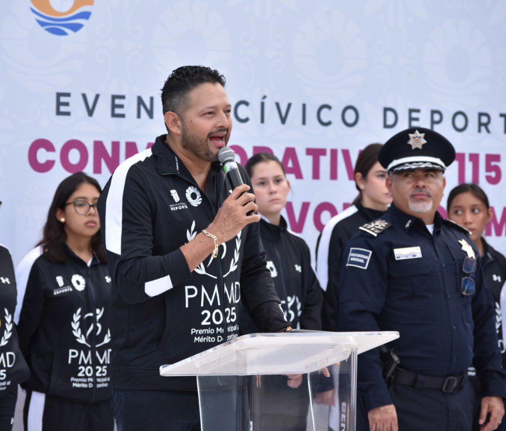 Cancún, Q. Roo, 20 de noviembre de 2025.- Con un emotivo acto cívico, deportivo y militar realizado en el Palacio Municipal, el Ayuntamiento de Benito Juárez conmemoró el 115 aniversario de la Revolución Mexicana. La ceremonia fue encabezada por la Presidenta Municipal, Ana Paty Peralta, acompañada por el Director General del Instituto del Deporte, Alejandro Luna López, autoridades municipales y los orgullosos ganadores del Premio Municipal al Mérito Deportivo 2025.