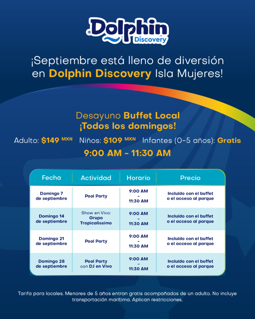 Los parques Dolphin Discovery Isla Mujeres y Parque Garrafón prepararon una cartelera con ambiente festivo, música en vivo, y una amplia oferta gastronómica para disfrutar todo el mes de septiembre, destacando su ya tradicional Desayuno Buffet Dominical y las populares Pool Parties con actividades recreativas para todas las edades. El calendario es el siguiente: