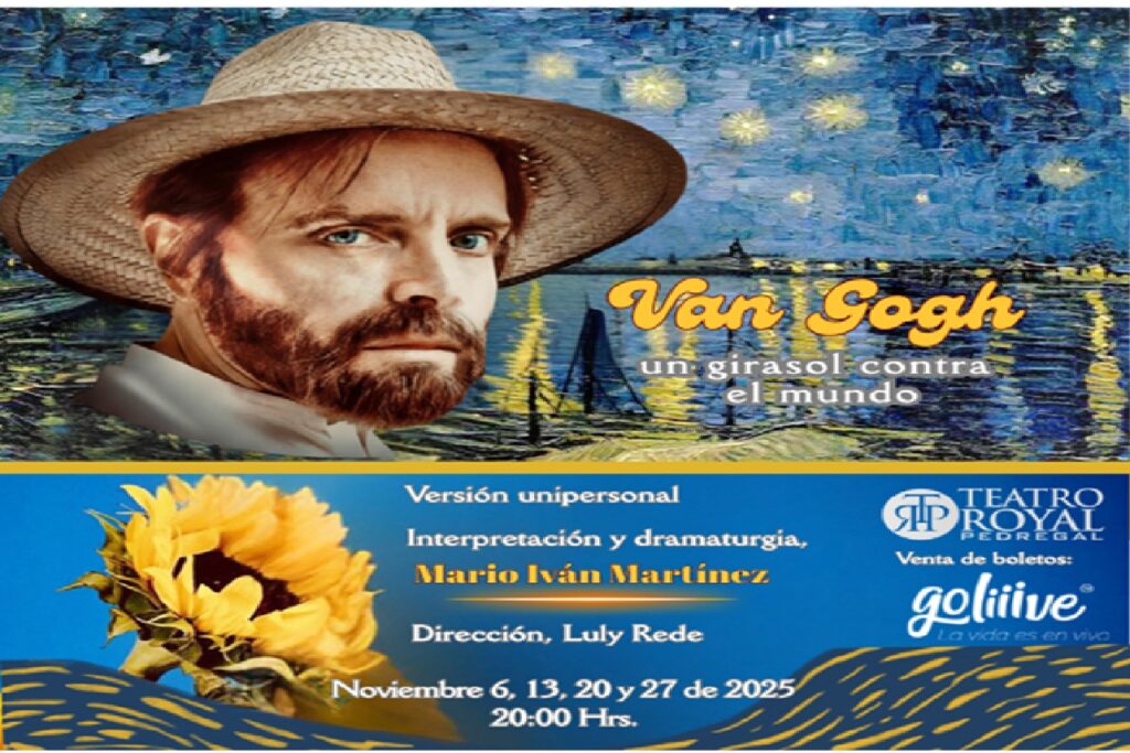 En los confines de la locura y la luz, donde el arte y la desesperación se funden en un mismo trazo, regresa a los escenarios Mario Iván Martínez con Van Gogh, un girasol contra el mundo, una pieza unipersonal escrita y protagonizada por él mismo bajo la dirección de Luly Rede. Esta temporada 2025, el Teatro Royal del Pedregal será el escenario donde el actor mexicano encarne, con la profundidad y el rigor que lo caracterizan, a uno de los espíritus más inquietos y luminosos del arte moderno: Vincent van Gogh.