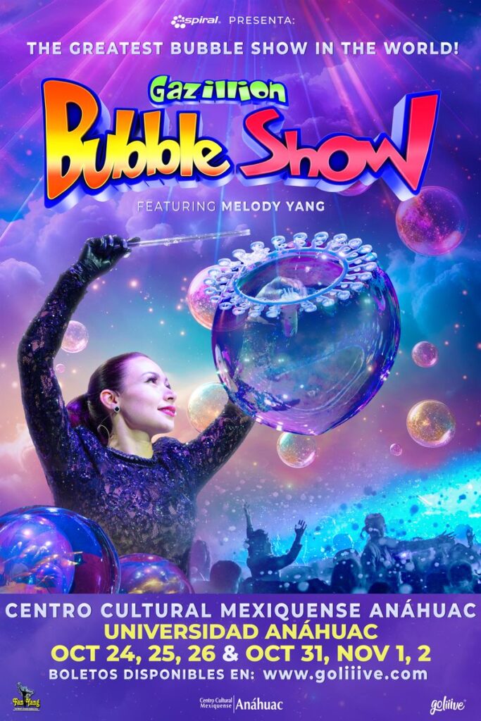 En una temporada limitada y exclusiva, del 24 de octubre al 2 de noviembre, los asistentes tendrán la oportunidad de vivir una experiencia sensorial e inolvidable donde el arte, la ciencia y la imaginación se funden en un universo único de burbujas. Este show se presentará en el Centro Cultural Mexiquense Anáhuac (CCMA) dentro de la Universidad Anáhuac del Norte. Boletos disponibles en https://www.goliiive.com/gazillion-bubble-show