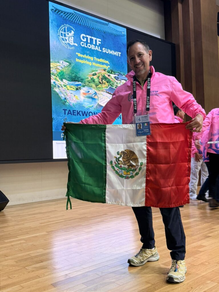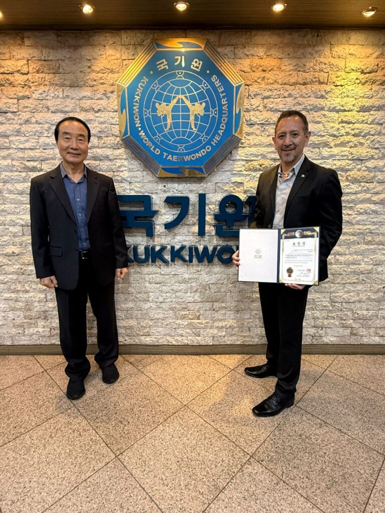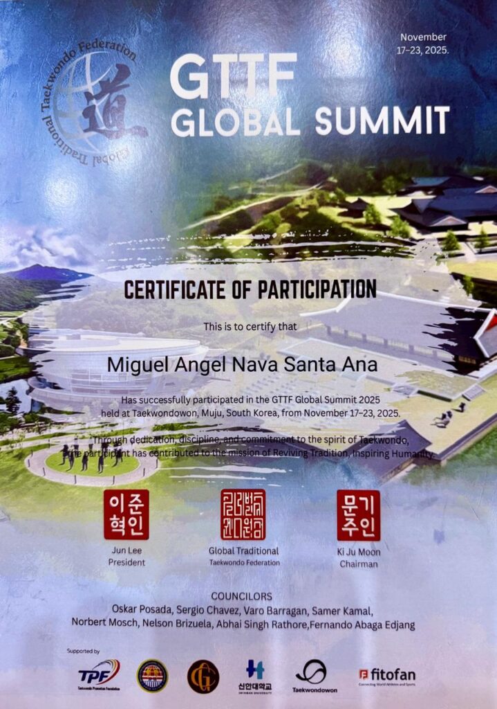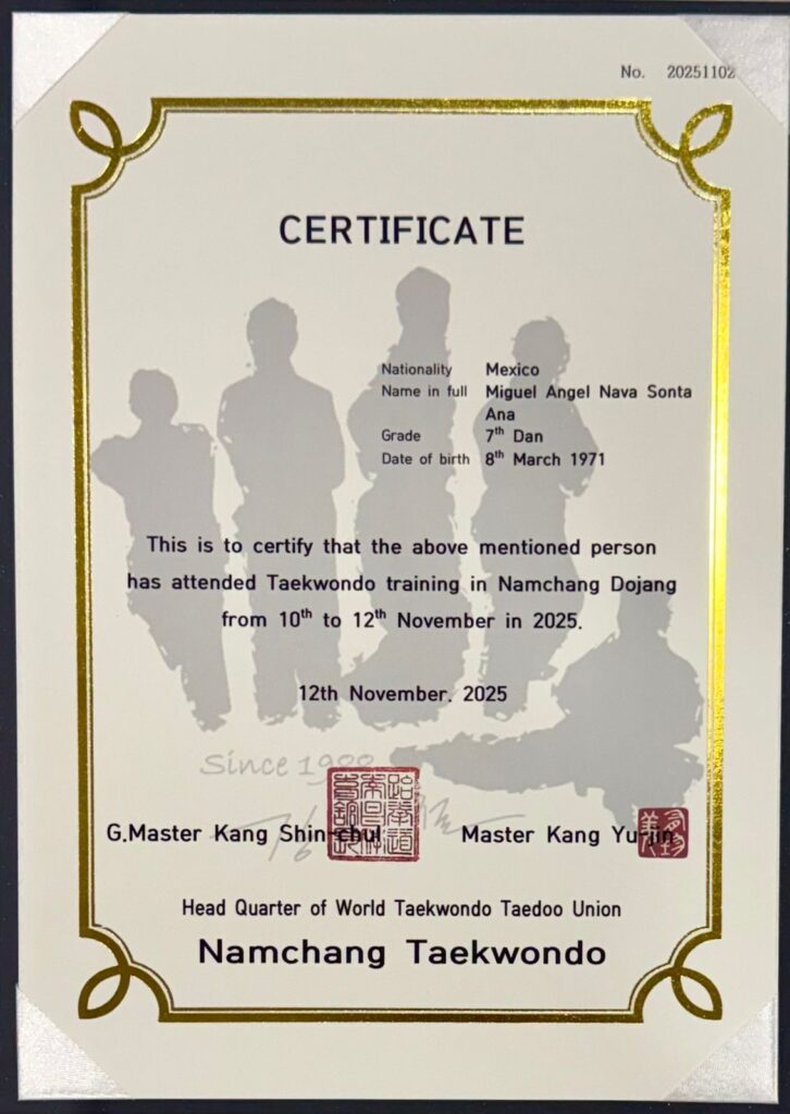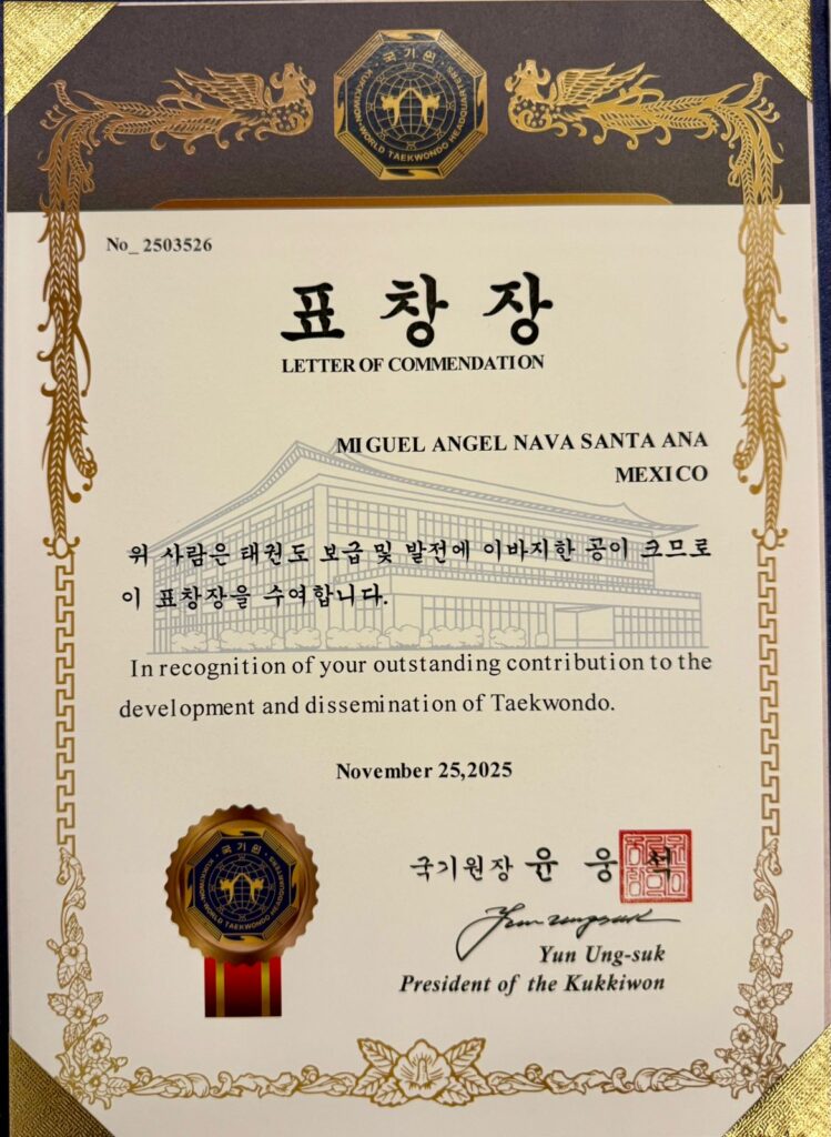 Ciudad de México a 28 de noviembre del 2025.- El Profesor Miguel Ángel Nava, estuvo presente en Seul Corea, del 8 al 28 del presente mes de noviembre, donde recibió un reconocimiento de las manos del presidente de Kukkiwon Yun Ung Suk, por su trayectoria y la aportación al desarrollo taekwondo mexicano.
