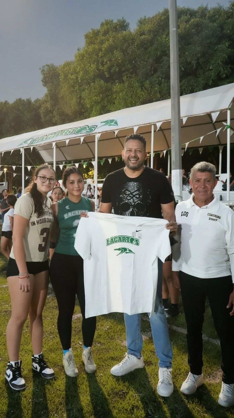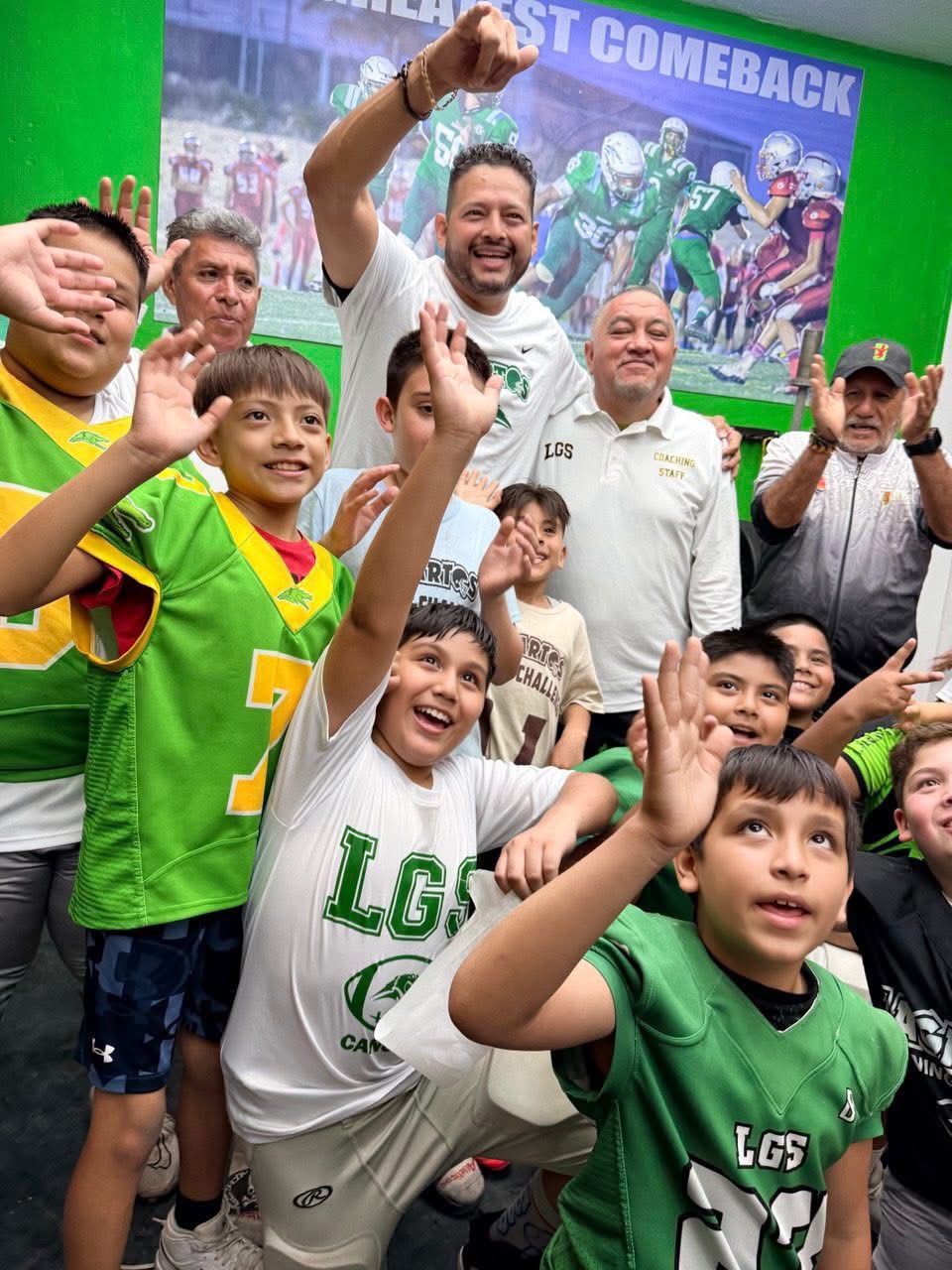Alejandro Luna López arribó emocionado al Campo Lagarto, donde fue recibido por un pasillo formado por jugadoras y jugadores del club. Entre porras, aplausos y choques de manos, el ambiente reflejó la unión y entusiasmo de la familia lagarta por este nuevo logro como parte de la transformación deportiva que vive el municipio, con el cual se complementará la formación integral de quienes practican el fútbol americano y flag.