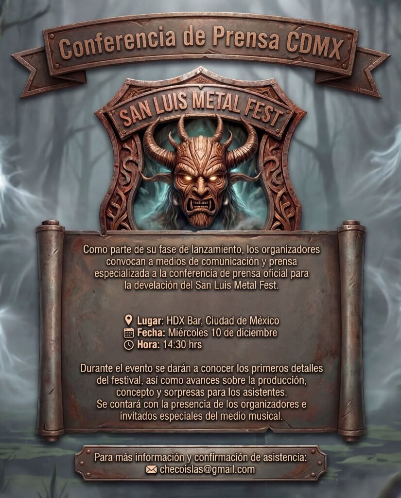 Y mientras la ola crece, la expectativa se concentra en una fecha clave: este miércoles 10 de diciembre, cuando en el HDX Bar de Azcapotzalco se celebrará una rueda de prensa que revelará los primeros detalles del San Luis Metal Fest. Será el momento en que los organizadores compartan avances sobre el concepto, sorpresas para los asistentes y pistas de la magnitud que alcanzará esta edición fundacional. Acompañados de invitados especiales y figuras prominentes del medio musical, convertirán esa reunión en la antesala de un anuncio que, según se anticipa, transformará el panorama metalero nacional.