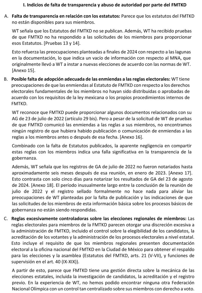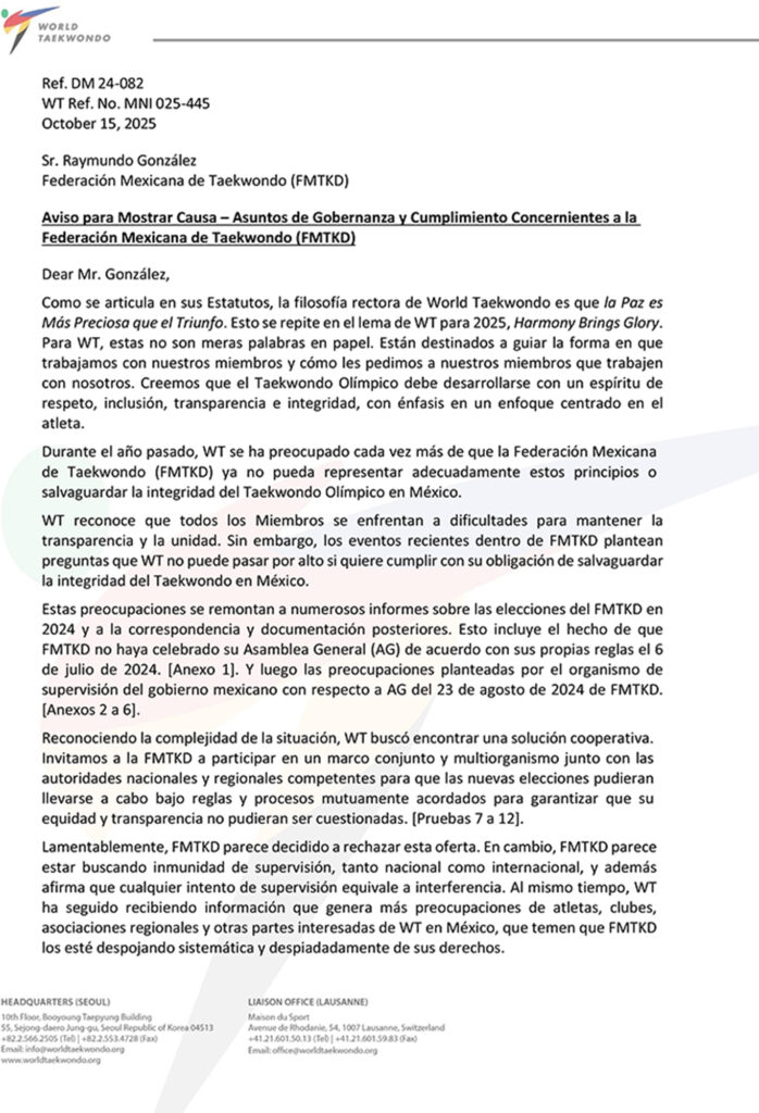 La World Taekwondo, organismo que rige el taekwondo deportivo a nivel mundial, envía comunicado a para el Sr. Raymundo González Pinedo, presidente de la A.C. denominada Federación Mexicana de Taekwondo, expedido por la WT, el 15 de octubre del presente año, donde le solicita aclarar Asuntos de Gobernanza y Cumplimiento Concernientes más 34 puntos importantes referente a la quejas y faltas que ha tenido la Federación Mexicana de Taekwondo, sin embargo la FMTKD, a hecho caso omiso al órgano de gestión provisional.