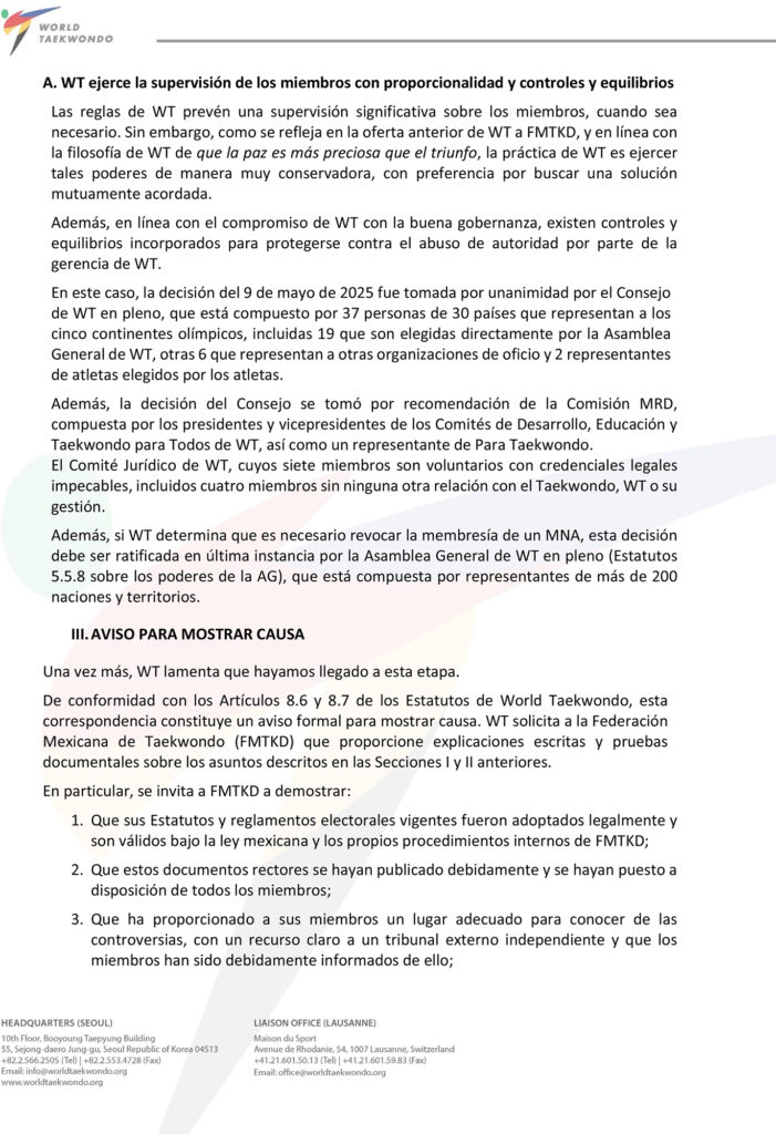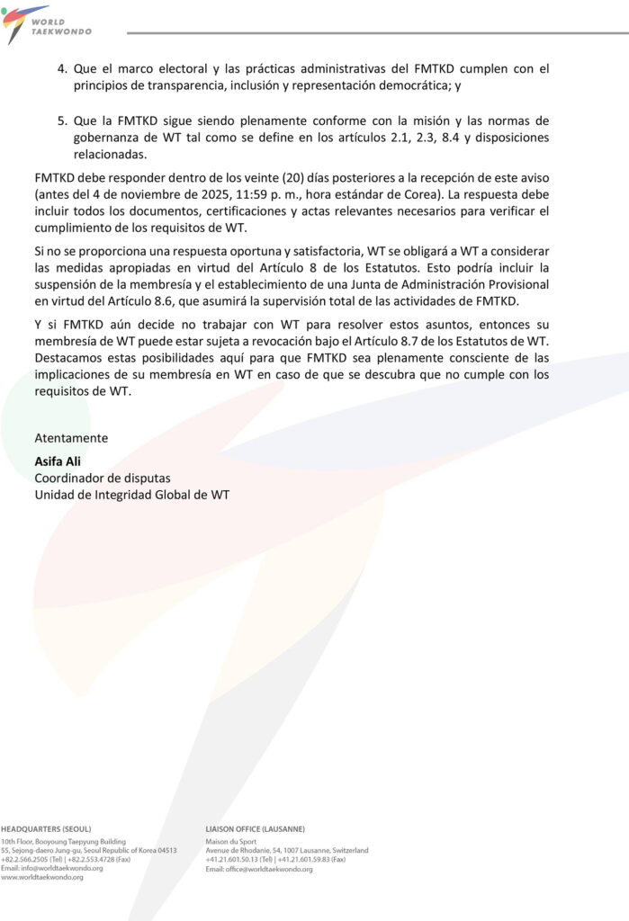 La respuesta debió incluir todos los documentos, certificaciones y actas relevantes necesarios para verificar el cumplimiento de los requisitos de WT. Sin embargo, no se proporcionó una respuesta oportuna y satisfactoria, se obligará a WT a considerar las medidas apropiadas en virtud del Artículo 8 de los Estatutos. Esto podría incluir la suspensión de la membresía de la FMTKD en la WT y el establecimiento de una Junta de Administración Provisional en virtud del Artículo 8.6, que asumirá la supervisión total de las actividades de FMTKD. Y si FMTKD aún decide no trabajar con WT para resolver estos asuntos, entonces su membresía de WT puede estar sujeta a revocación bajo el Artículo 8.7 de los Estatutos de WT. Se destaco estas posibilidades para que FMTKD sea plenamente consciente de las implicaciones de su membresía en WT en caso de que se descubra que no cumple con los requisitos de WT.